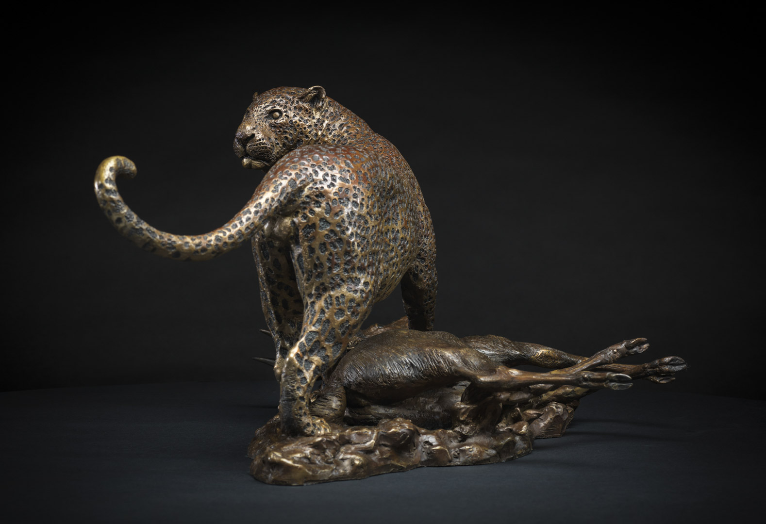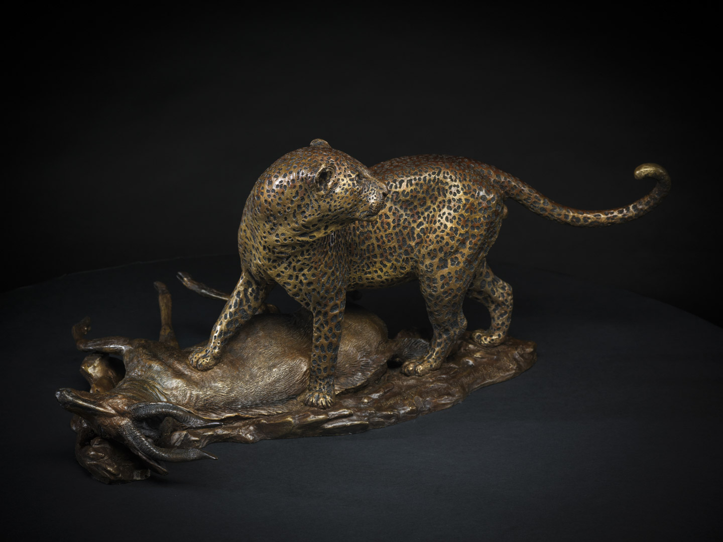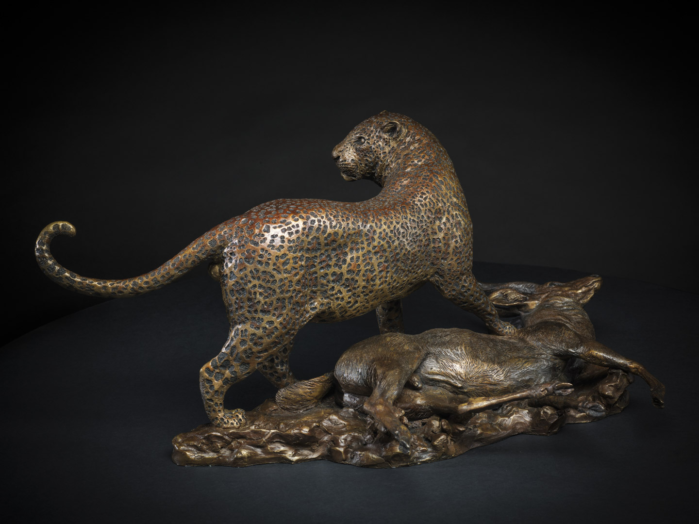 Masailand Bushbuck and Leopard Species: Edition: Height: 29 cmWidth: 40 cmLength: 64.5 cmWeight: 17.65 kgMaterial: BronzeAvailable View Spin