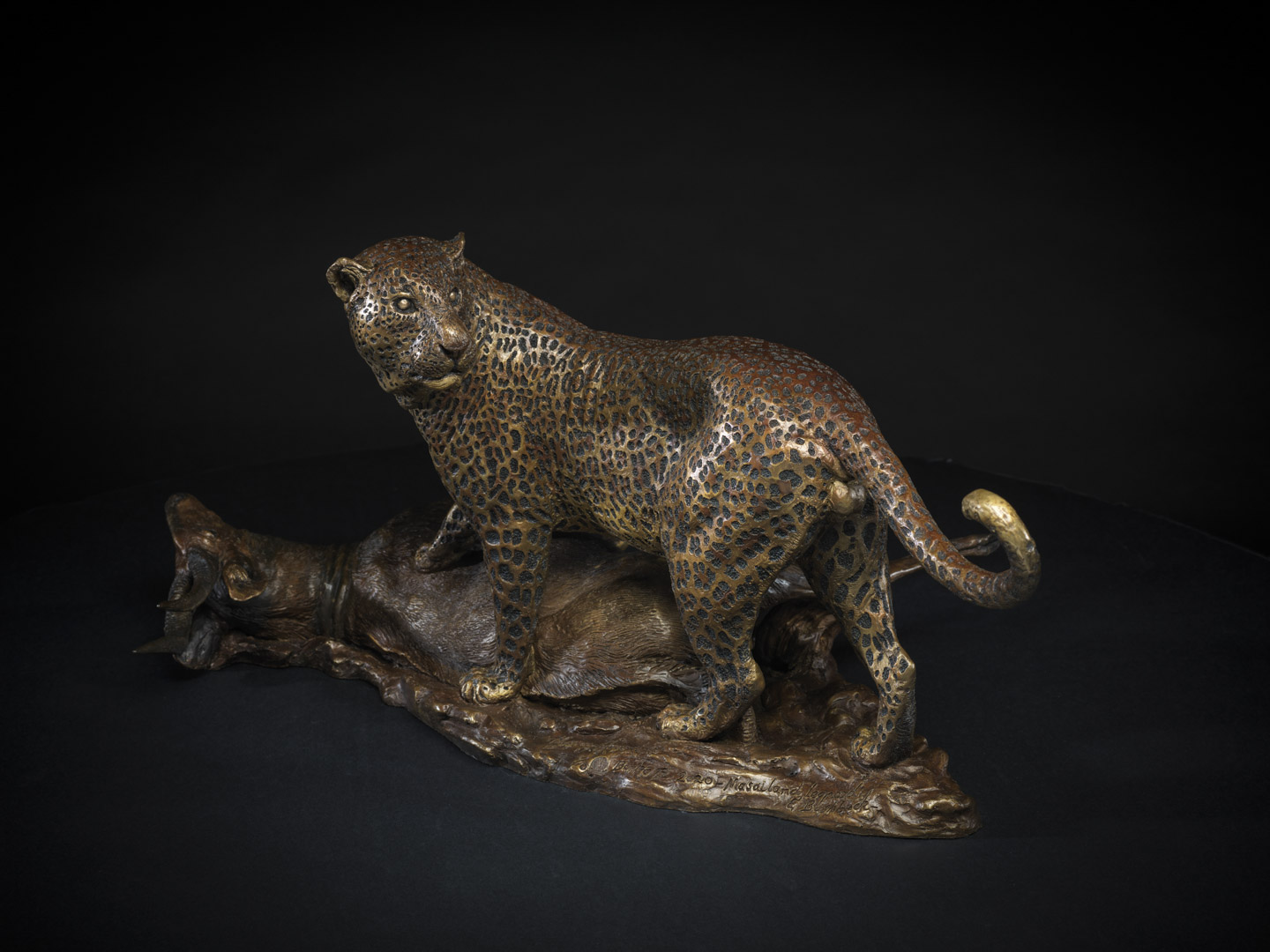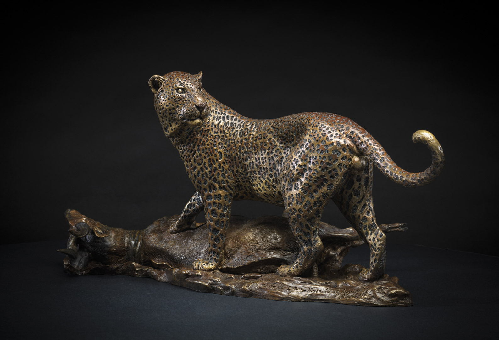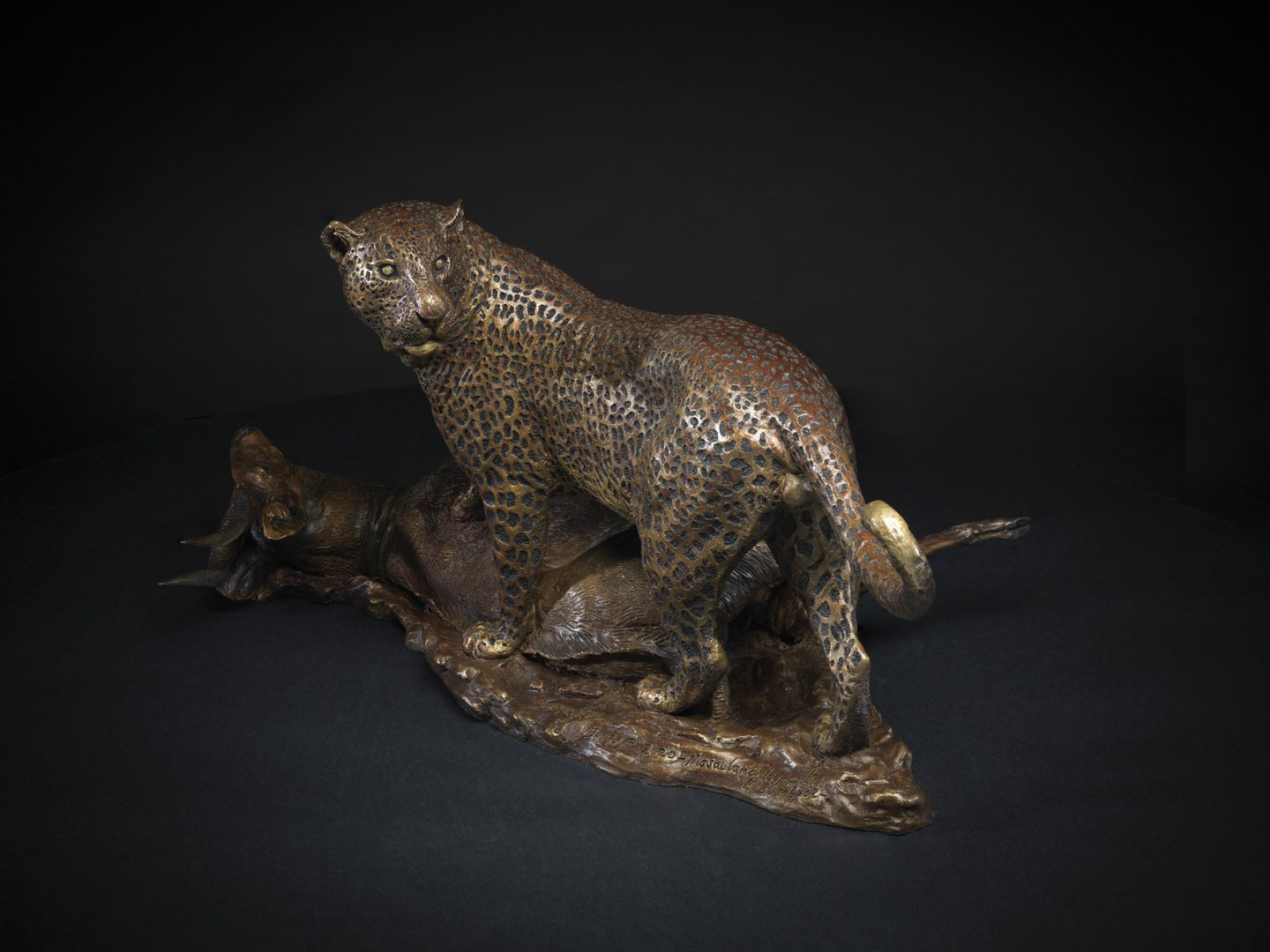 Masailand Bushbuck and Leopard Species: Edition: Height: 29 cmWidth: 40 cmLength: 64.5 cmWeight: 17.65 kgMaterial: BronzeAvailable View Spin